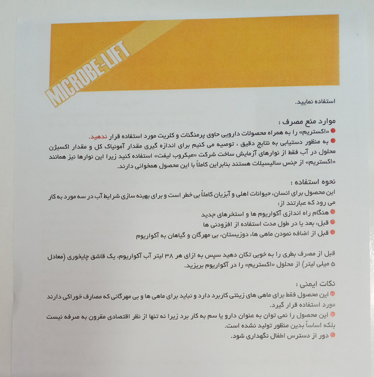 نحوه مصرف: هنگام راه اندازی آکواریوم، قبل و بعد یا در طول مدت استفاده از افزودنیها، قبل از اضافه نمودن ماهیها، دوزیستان، بی مهرگان و گیاهان به آکواریوم. قبل از مصرف بطری را به خوبی تکان دهید سپس به ازای هر ۳۸ لیتر ۵ میل استفاده کنید
