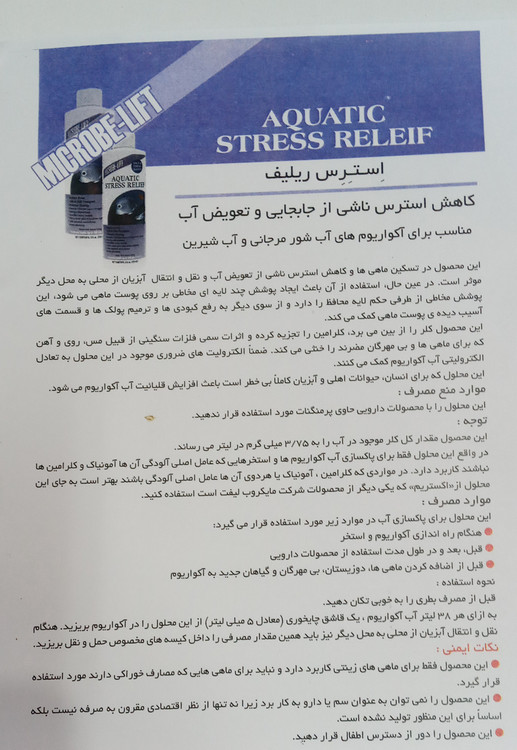 کاهش استرس ناشی از جابجایی و تعویض آب ، مناسب برای آکواریومهای آب شور مرجانی( ریف سیف) و آب شیرین ، این محصول در تسکین ماهیها و کاهش استرس ناشی از تعویض آب و نقل و انتقال آبزیان از محلی به محل دیگر موثر است