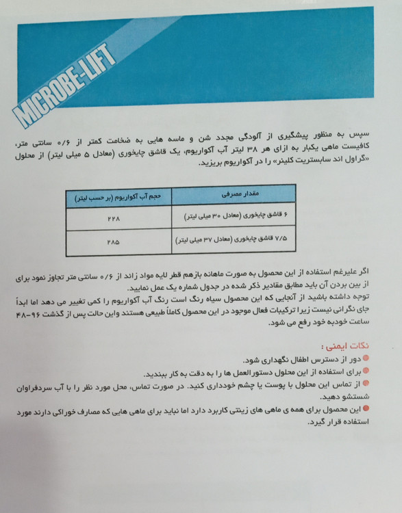 مقدار مصرف: به ازای هر ۳۸ لیتر ۱۰ میل استفاده کنید، هر ۲ هفته یکبار تا زمانی که شنها کاملا تمیز شوند.
