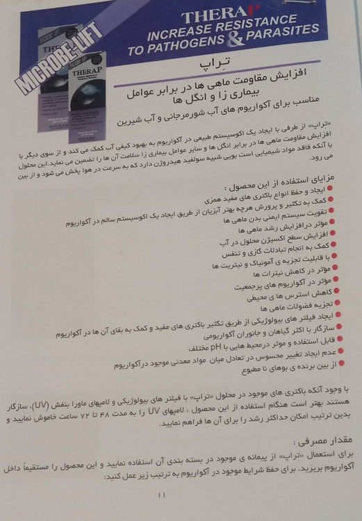 تراپ : از طرفی با ایجاد یک اکوسیستم طبیعی در آکواریوم به بهبود کیفی آب کمک میکند و از سوی دیگر با افزایش مقاومت ماهیها در برابر انگل ها و سایر عوامل بیماری زا سلامت آنها را تضمین مینماید، این محلول فاقد مواد شیمیایی است