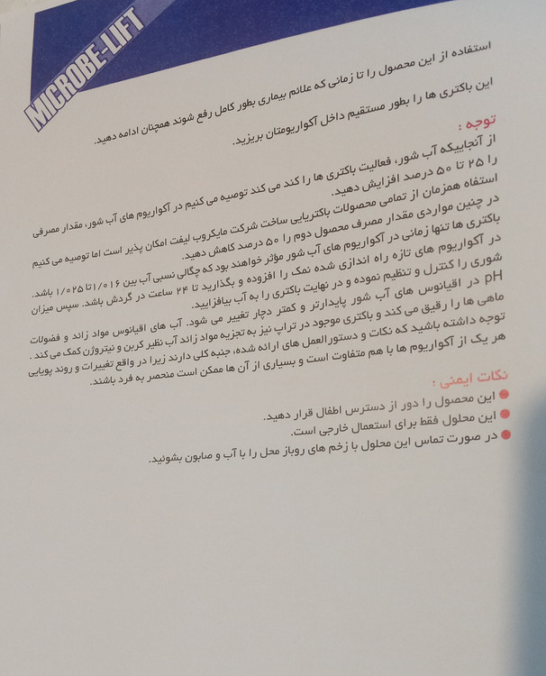 مقدار مصرفی: برای استفاده از این محصول از پیمانه ی موجود در بسته بندی آن استفاده کنید و این محصول را مستقیما داخل آکواریوم بریزید، برای حفظ شرایط موجود در آکواریوم به ترتیب زیر عمل کنید: این محصول در حضور کربن فعال و محصولات دارویی که حاوی مس هستند نیز به خوبی عمل میکند ، در صورت بالا بودن جمعیت ماهیها در آکواریوم، میزان مصرف اعلام شده میبایست افزایش یابد ، کلر و کلرامین زیاد ممکن است به شدت روی اثر این محصول تاثیر گذارد، بنابراین پس از افزودن داروها بخصوص آنتی بیوتیک ۷۲ ساعت صبر کرده و سپس این باکتری را بیفزایید .