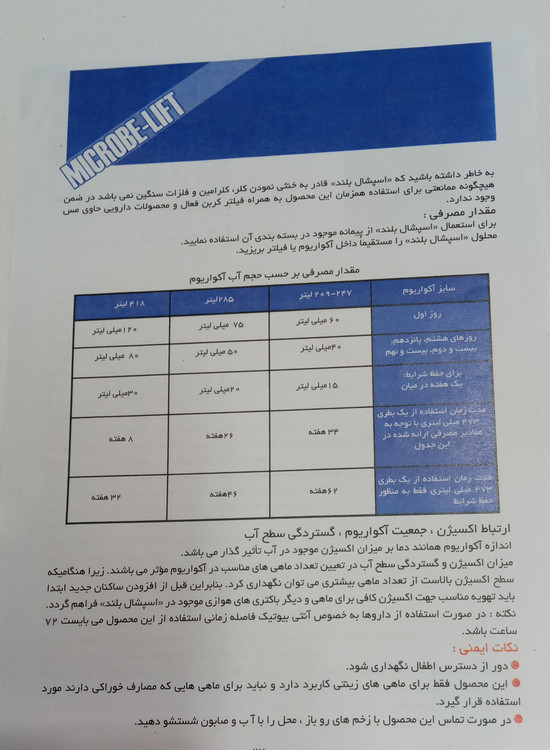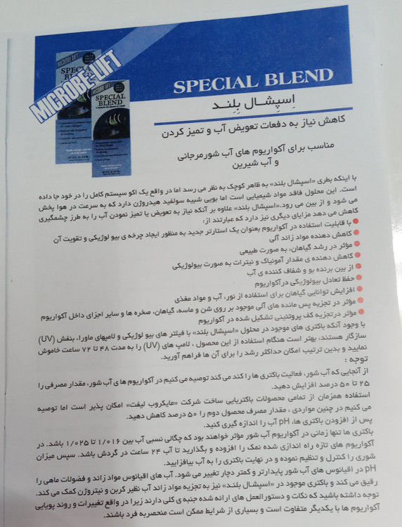 مزایای استفاده از این محصول: ۱.با قابلیت استفاده در آکواریوم به عنوان یک استارتر جدید به منظور ایجاد چرخه ی بیولوژیکی و تقویت آن ۲.کاهش دهنده ی مواد زائد آلی۳.موثر در رشد گیاهان به صورت طبیعی ۴.کاهش دهنده ی مقدار آمونیاک و نیترات به صورت بیولوژیکی۵. از بین برنده ی بو و شفاف کننده ی آب ۶.حفظ تعادل ببولوژیکی در آکواریوم ۷. افزایش توانایی گیاهان برای استفاده از نور، آب و مواد مغذی ۸. موثر در تجزیه ی پس مانده های آلی موجود بر روی شن و ماسه ، گیاهان ، صخره ها و سایر اجزای داخل آکواریوم ۹. موثر در تجزیه ی کف پروتئینی تشکیل شده در آکواریوم. توضیحات تکمیلی عکس ۴ و ۵ داخل بروشور توضیح کامل