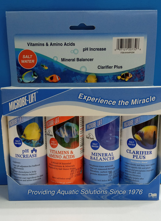 پک ۴ عددی کامل مخصوص استفاده در انواع آکواریومهای آب شور و شیرین شامل : ۱_پی اچ اینکریس: بالابرنده ی ph آب که پی اچ رو به سمت بافر سوق میدهد و باعث کاهش استرس میشود ,جلوگیری از به وجود آمدن جلبکها و خزه ها۲_ ویتامین و آمینو اسید: این محصول در واقع مخلوطی از ذرات مغذی بسیار ریز و مواد معدنی مورد نیاز برای تقویت و شادابی ماهیهای آب شور و شیرین میباشد، این محلول فاقد: فسفاتها ، سیلیکاتها،نیتراتها و فلزات سنگین میباشد و هیچ تاثیری بر ph, درجه سختی آب قلیاییت آب ندارد، ۳_مینرال بالانسر:جایگزین کننده ی عناصر کمینه مناسب برای کلیه ی آکواریومها، عناصر آب توسط آبزیان مصرف میشوند و آب فقیر از مواد معدنی میشود شما میتوانید با استفاده از این محصول مواد معدنی را به آب برگردانید، این محصول حاوی ۶۰ عنصر موجود در آب دریاست که میتوانید به عنوان مکمل از آن استفاده کنید.۴_کلاریفایر پلاس( شفاف کننده ی آب) جذب ذرات معلق موجود در آب و تبدیل آنها به رسوب،برطرف نمودن سریع کدری و تیرگی آب، بهینه سازی فیلتراسیون، محصولی مفید و کارآمد به ویژه برای دوران پس از بروز اختلال در آکواریوم